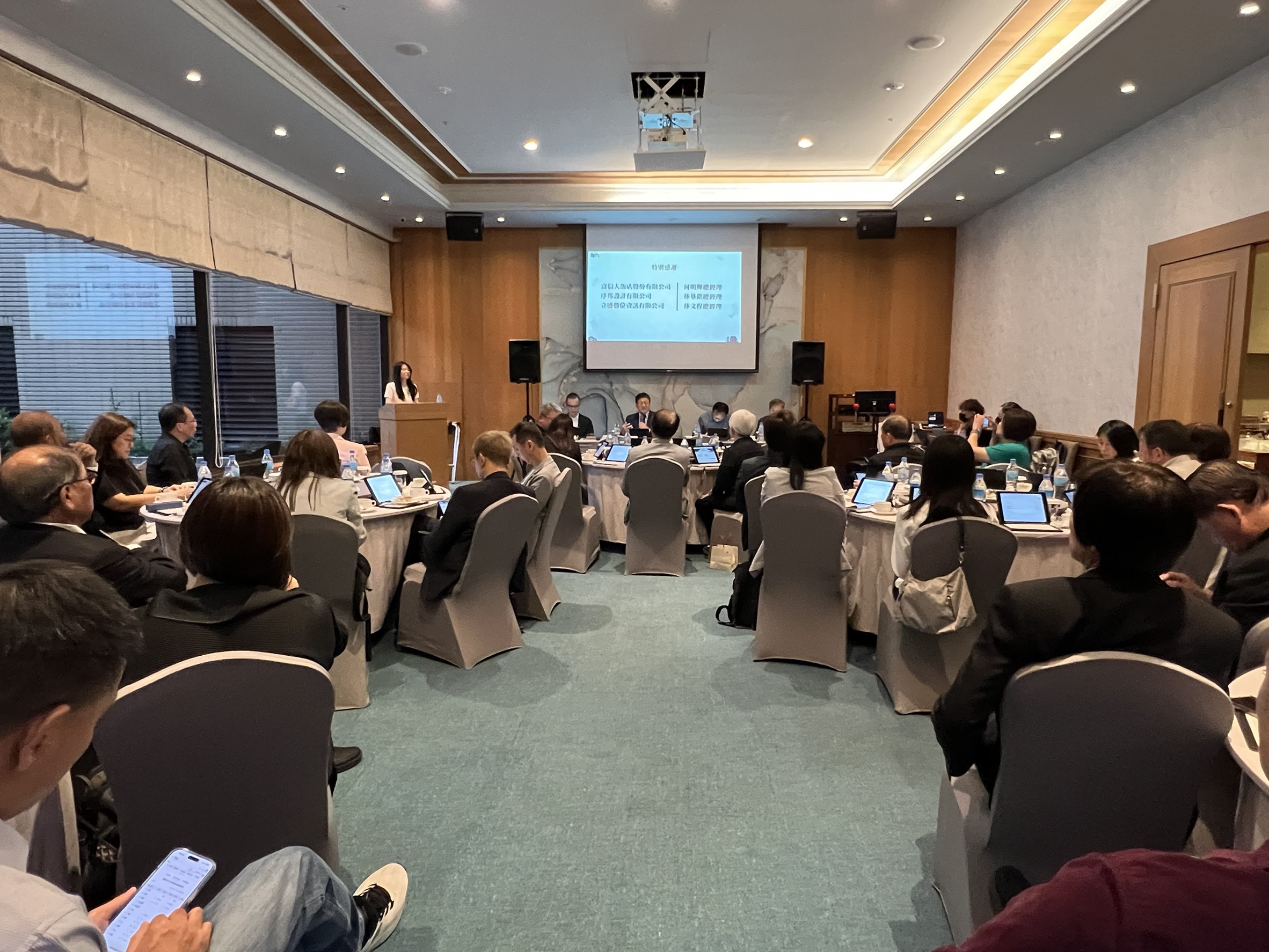 本會於本(114)年10月31日假台北富信大飯店怡園廳召開第六屆第九次理監事聯席會,由邱揮立理事長主持,計有42位理監事、名譽理事及會務顧問撥冗與會。 會議開始前,特別邀請立盛數位資訊有限公司林文程總經理介紹Vurbo.ai 即時翻譯系統,分享其特色與實際應用情形,供與會者提供參考選擇。
